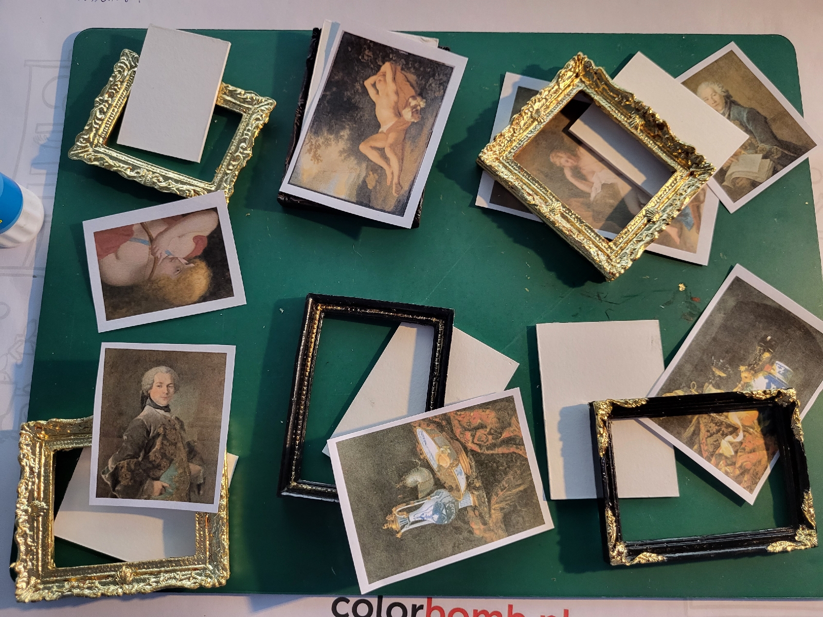 I have also silvered the brass frame for te standing mirror on the table with the hats. you can see it in its unsilvered state in the top photo. I have already shown you the result of that mirror in my post a few weeks ago. So I will not repeat that here. You will see it again soon when I have refurnished the completed room that I will show you next week.