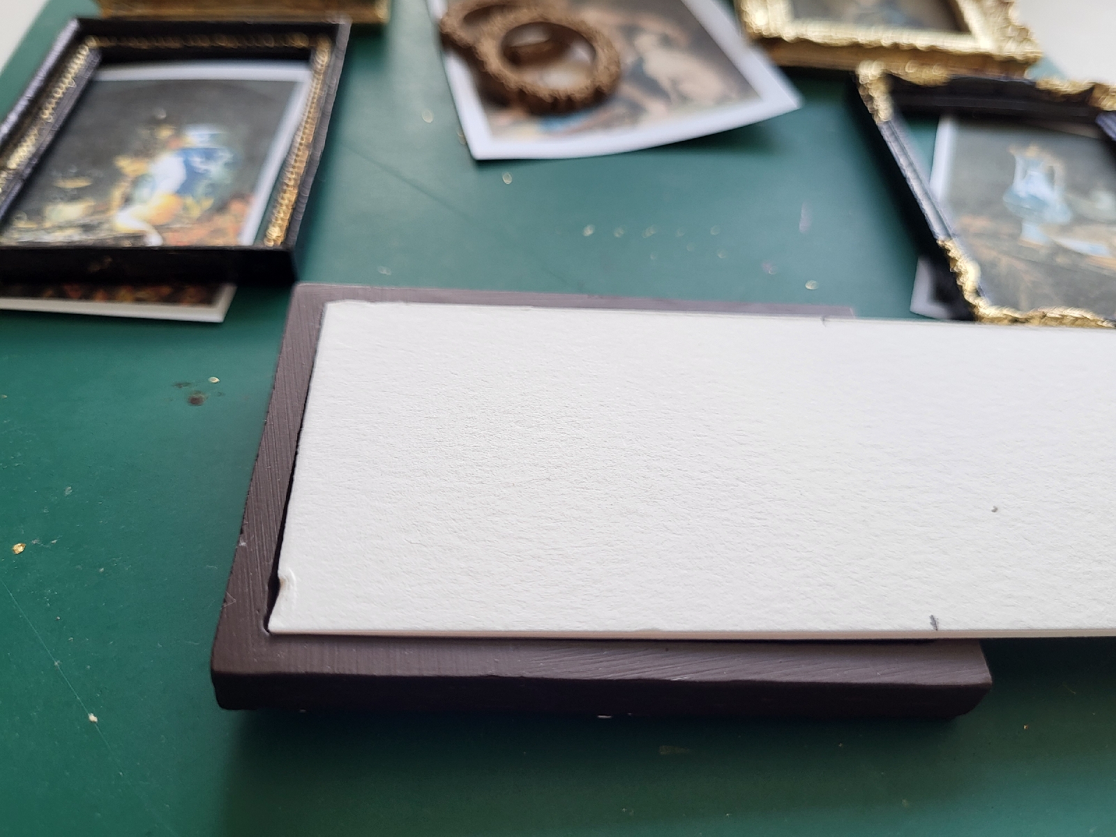 I want to hang two framed silhouettes on the back wall of the dressing room. The small strip to the right of the door leading into the powdering room is too narrow to add panels but too wide to leave bare. There is not much that can go there though. These inexpensive resin frames came from 'Action' a cheap store over here with all and sundry at bargain prices. The 'gold' colour is appaling. Nothing like the real stuff, so I gilded them using gold leaf on aplied on gold size.